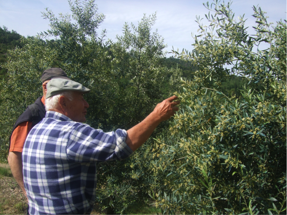 Les vignes ont été données à sa retraite en 2003 à ses neveux, son fils étant instituteur comme sa mère à Ansouis, n’en faisant pas usage, mais lui Guy a gardé deux cultures essentielles pour cette période soi disant plus calme de la vie: il a planté en deux fois, 2003 et 2004, cent dix oliviers magnifiques, en fleurs ces jours et prometteurs d’une bonne récolte (de 1 à 2 litres par pied selon l’année). De ce coté nord le champ d’oliviers est dominé par la forêt communale de pins coupés tous les quarante ans environ par les forestiers, alors que les chênes ne l’ont pas été depuis 1945.