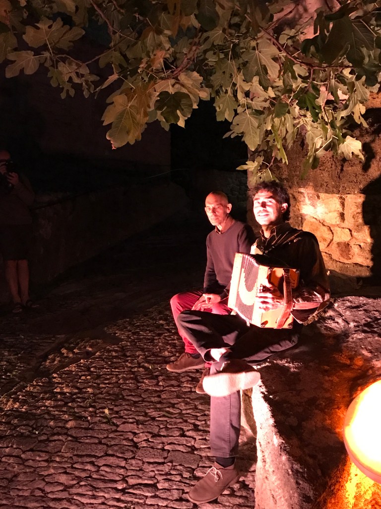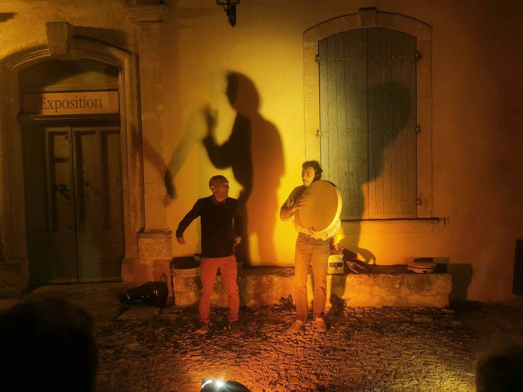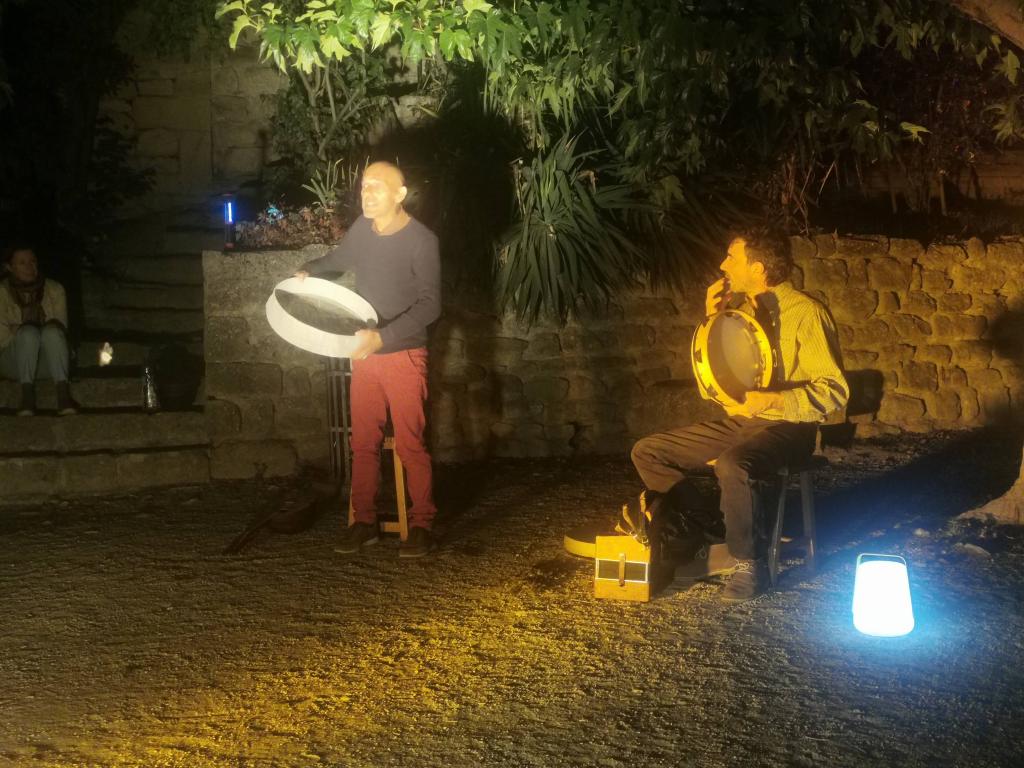 Renat Sette et Mario Lecche sont conteurs, chanteurs et musiciens. Ils nous ont dit et chanté l’histoire de Jean des Pierres. Ce conte est une adaptation d’une légende bretonne recueillie par Pierre Jakaez Héliaz et adaptée par Jean-Yves Royer, poète de Forcalquier. Il raconte l’histoire de ce berger qui entendait le chant des pierres. Grace à ce savoir il construit calades et restanques. Renat raconte. Il chante aussi des chansons provençales accompagné par Mario. Ils s’appuient sur une mandoline, un accordéon diatonique et des percussions. Ils nous font aussi entendre le chant des cailloux, cognés entre eux, frappés par une masse et un burin, sensuellement frottés dans un tamis.