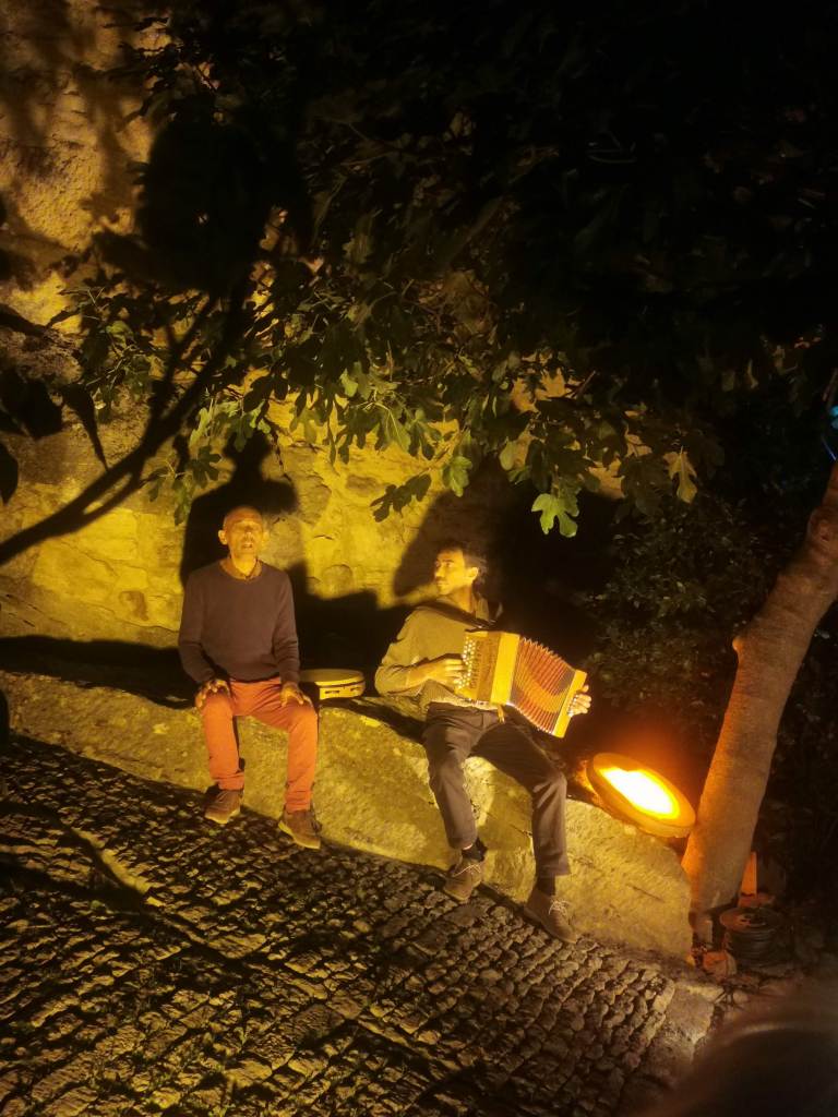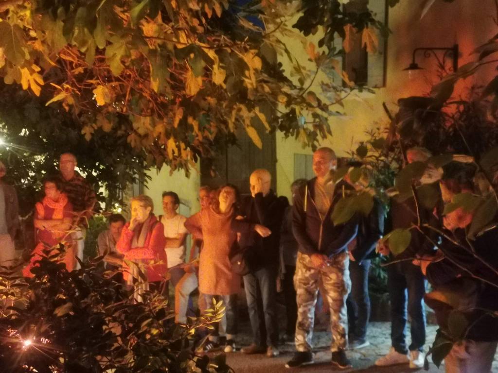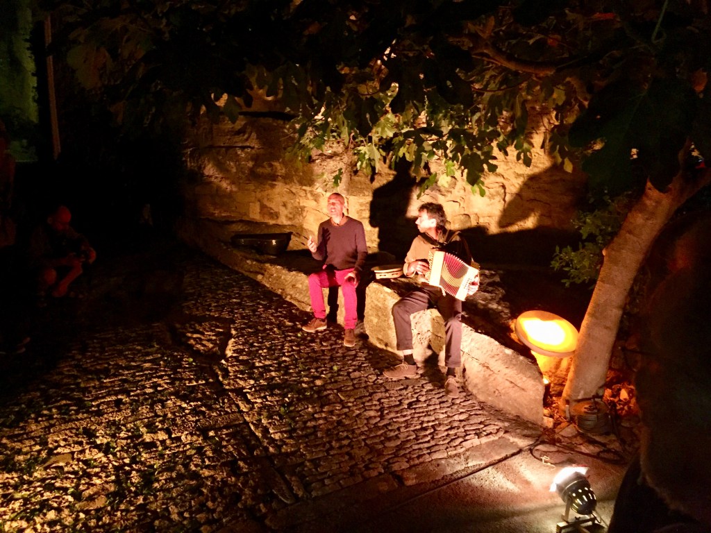 Auparavant, vendredi soir, petits et grands avaient suivi la balade musicale. Elle a commencé dans la rue du petit Portail. La Place Saint Élzéar, par laquelle la promenade passe habituellement était encombrées du flot des voitures traversant Ansouis. C’était l’effet de l’indisponibilité du passage par le pont. Nous sommes donc passés par la rue du Buis pour aller à la rue du Rocher, première étape de la balade. Ensuite les chanteurs nous ont conduits au petit jardin puis jusqu’à l’église et au presbytère.