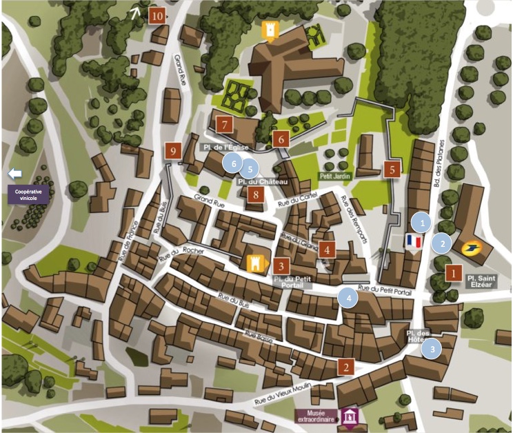 – Le circuit historique, 10 panneaux devant les principaux monuments du village qui permettent au visiteur de s’informer sur le passé du village (pastilles carrées rouge sur le plan)